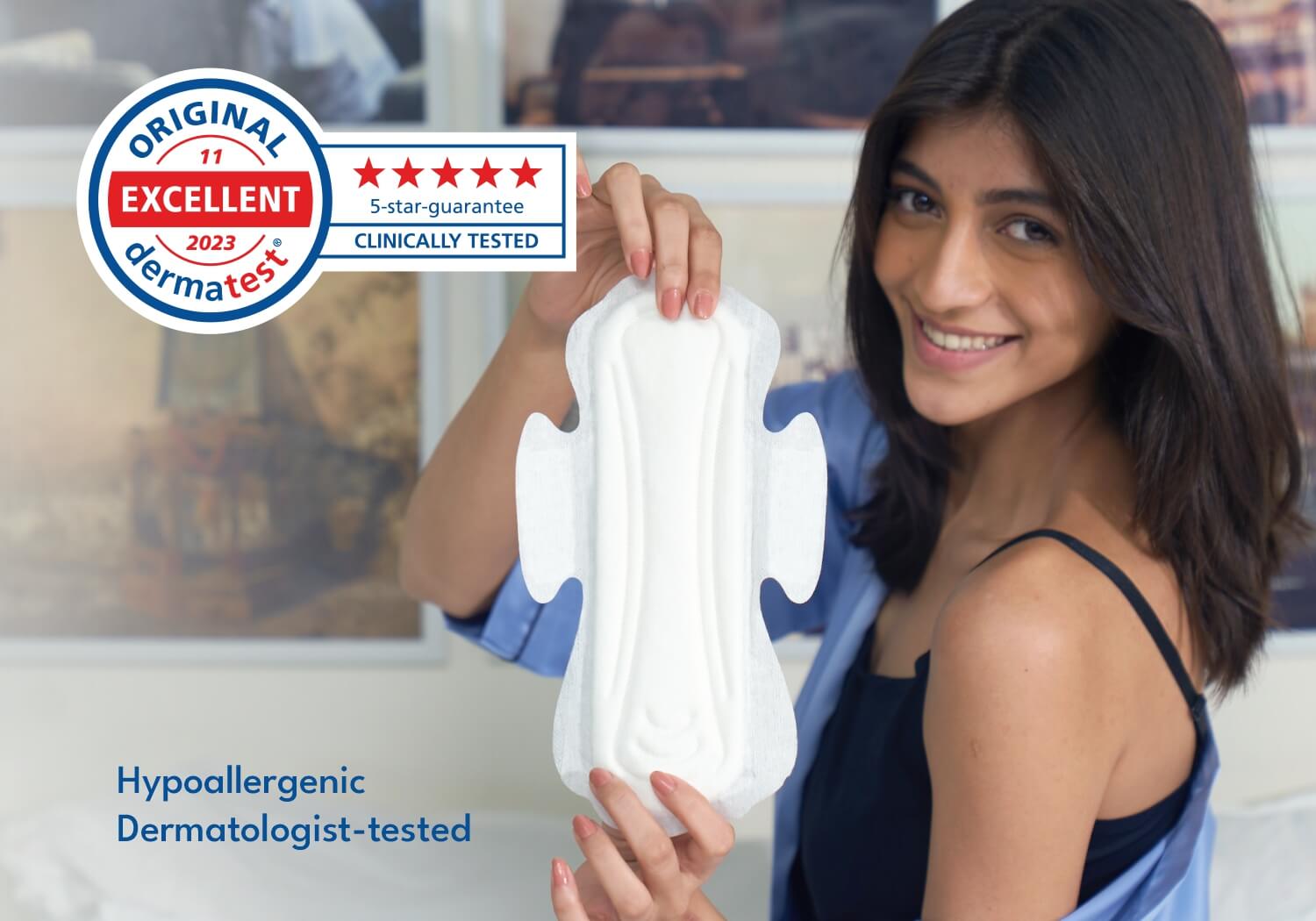 Sparkle plant-based pads are soft, safe, skin-friendly, and have earned the 5-star seal from Dermatest®, which means that no relevant skin reactions (i.e., potential for skin irritations) were detected from a clinical-dermatological study.