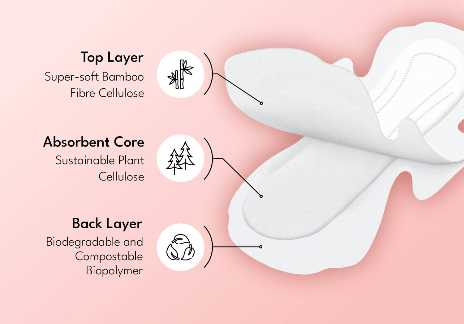 Designed with plant-based materials in every layer - no conventional plastics or synthetic gels in topsheet, absorbent core or back layer - making them suitable for sensitive skin.