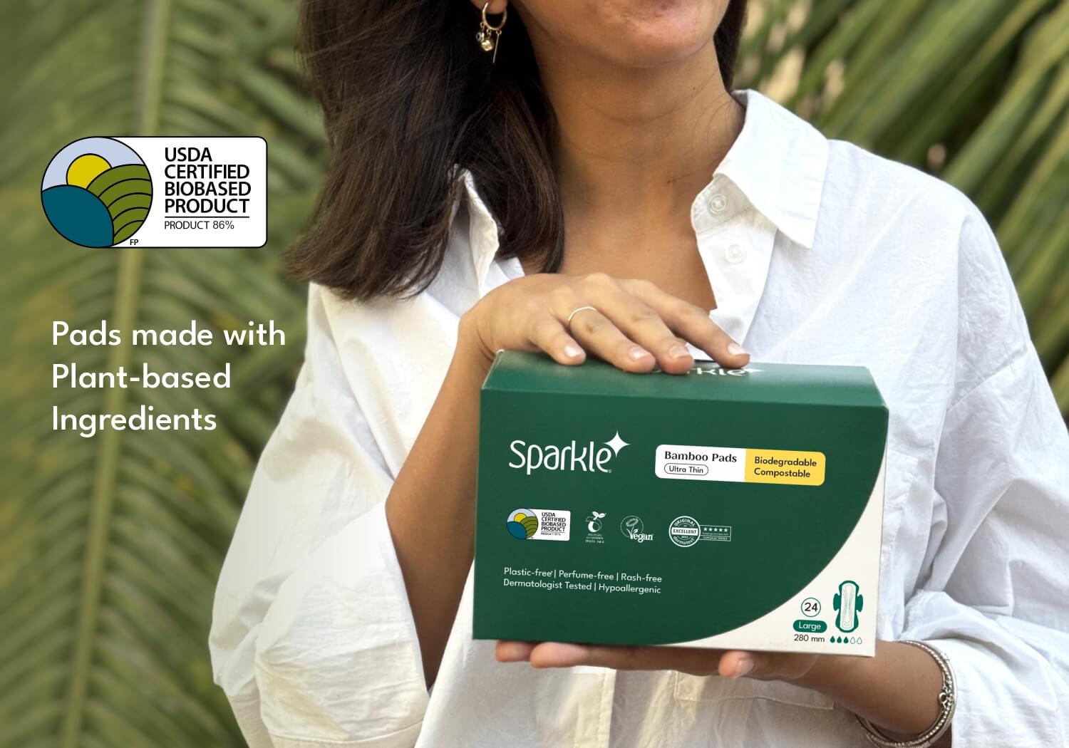 In Sparkle pads, we do not use conventional plastics in any of the layers; instead, we use plant-based materials, making it the most skin-friendly and planet-friendly choice!