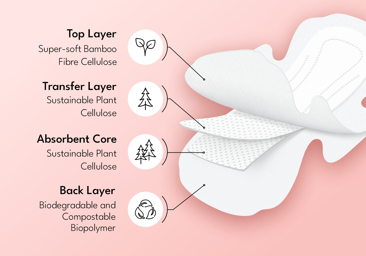 Designed with plant-based materials in every layer - no conventional plastics or synthetic gels in topsheet, absorbent core or back layer - making them suitable for sensitive skin.