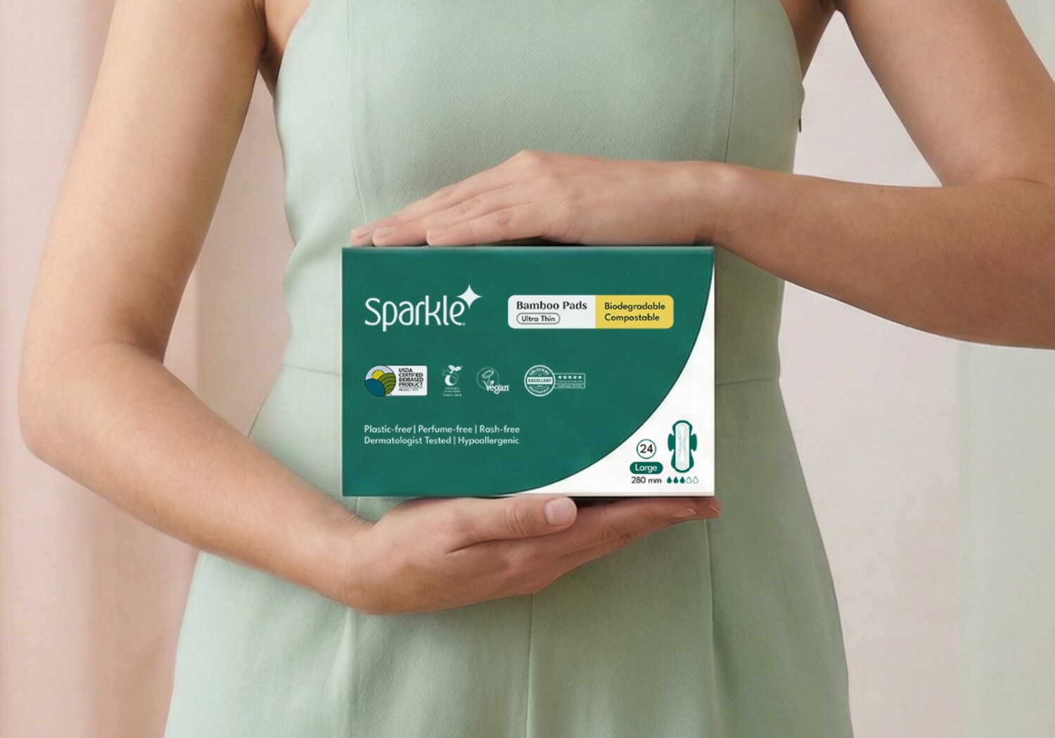 "I personally struggled with irritation from plastic-based pads, which inspired me to create Sparkle. Each pad is thoughtfully designed layer by layer using plant-based materials, removing plastics, fragrances, and synthetic absorbent gel to offer gentle care for sensitive skin."